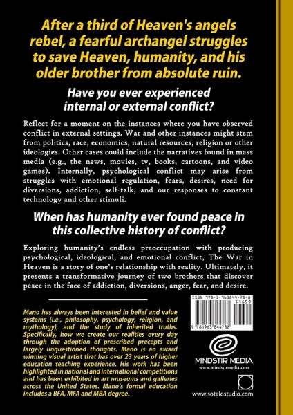 After a third of Heaven's angels rebel, a fearful archangel struggles to save Heaven, humanity, and his older brother from absolute ruin. Have you ever experienced internal or external conflict? Reflect for a moment on the instances where you have observed conflict in external settings. War and other instances might stem from politics, race, economics, natural resources, religion, or other ideologies. Other cases could include the narratives found in mass media (e.g., the news, movies, tv, books, cartoons, and video games). Internally, psychological conflict may arise from struggles with emotional regulation, fears, desires, need for diversions, addiction, self-talk, and our responses to constant technology and other stimuli. When has humanity ever found peace in this collective history of conflict? Exploring humanity's endless preoccupation with producing psychological, ideological, and emotional conflict, The War in Heaven is a story of one's relationship with reality. Ultimately, it presents a transformative journey of two brothers that discover peace in the face of addiction, diversions, anger, fear, and desire. The War in Heaven is a fully-illustrated graphic novel spanning 130 pages, presented in a classic black and white style.