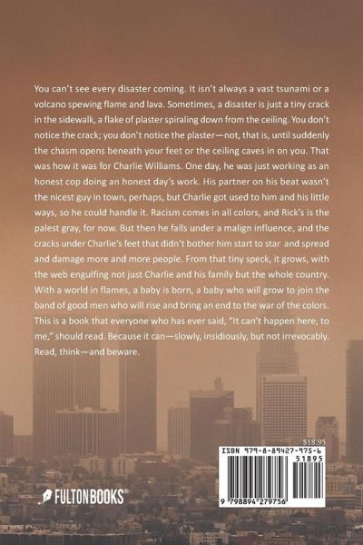 You can't see every disaster coming. It isn't always a vast tsunami or a volcano spewing flame and lava. Sometimes, a disaster is just a tiny crack in the sidewalk, a flake of plaster spiraling down from the ceiling. You don't notice the crack; you don't notice the plaster--not, that is, until suddenly the chasm opens beneath your feet or the ceiling caves in on you. That was how it was for Charlie Williams. One day, he was just working as an honest cop doing an honest day's work. His partner on his beat wasn't the nicest guy in town, perhaps, but Charlie got used to him and his little ways, so he could handle it. Racism comes in all colors, and Rick's is the palest gray, for now. But then he falls under a malign influence, and the cracks under Charlie's feet that didn't bother him start to star and spread and damage more and more people. From that tiny speck, it grows, with the web engulfing not just Charlie and his family but the whole country. With a world in flames, a baby is born, a baby who will grow to join the band of good men who will rise and bring an end to the war of the colors. This is a book that everyone who has ever said, "It can't happen here, to me," should read. Because it can--slowly, insidiously, but not irrevocably. Read, think--and beware.