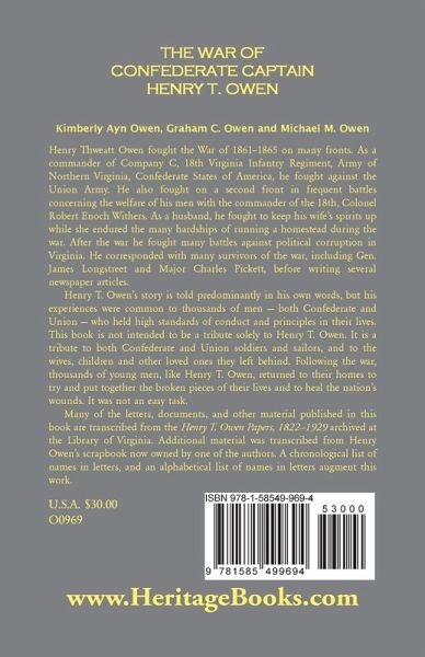 Henry Thweatt Owen fought the War of 1861-1865 on many fronts. As a commander of Company C, 18th Virginia Infantry Regiment, Army of Northern Virginia, Confederate States of America, he fought against the Union Army. He also fought on a second front in frequent battles concerning the welfare of his men with the commander of the 18th, Colonel Robert Enoch Withers. As a husband, he fought to keep his wife's spirits up while she endured the many hardships of running a homestead during the war. After the war he fought many battles against political corruption in Virginia. He corresponded with many survivors of the war, including Gen. James Longstreet and Major Charles Pickett, before writing several newspaper articles. Henry T. Owen's story is told predominantly in his own words, but his experiences were common to thousands of men-both Confederate and Union-who held high standards of conduct and principles in their lives. This book is not intended to be a tribute solely to Henry T. Owen. It is a tribute to both Confederate and Union soldiers and sailors, and to the wives, children and other loved ones they left behind. Following the war, thousands of young men, like Henry T. Owen, returned to their homes to try and put together the broken pieces of their lives and to heal the nation's wounds. It was not an easy task. Many of the letters, documents, and other material published in this book are transcribed from the Henry T. Owen Papers, 1822-1929 archived at the Library of Virginia. Additional material was transcribed from Henry Owen's scrapbook now owned by one of the authors. A chronological list of names in letters, and an alphabetical list of names in letters augment this work.
