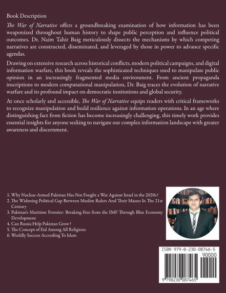 Book Description The War of Narrative offers a groundbreaking examination of how information has been weaponized throughout human history to shape public perception and influence political outcomes. Dr. Naim Tahir Baig meticulously dissects the mechanisms by which competing narratives are constructed, disseminated, and leveraged by those in power to advance specific agendas. Drawing on extensive research across historical conflicts, modern political campaigns, and digital information warfare, this book reveals the sophisticated techniques used to manipulate public opinion in an increasingly fragmented media environment. From ancient propaganda inscriptions to modern computational manipulation, Dr. Baig traces the evolution of narrative warfare and its profound impact on democratic institutions and global security. At once scholarly and accessible, The War of Narrative equips readers with critical frameworks to recognize manipulation and build resilience against information operations. In an age where distinguishing fact from fiction has become increasingly challenging, this timely work provides essential insights for anyone seeking to navigate our complex information landscape with greater awareness and discernment.