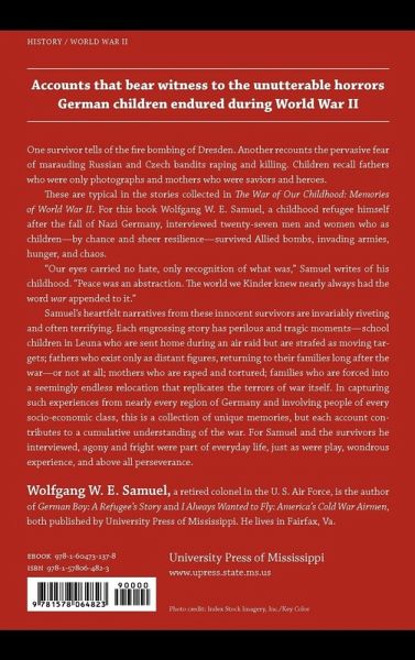 Accounts that bear witness to the unutterable horrors German children endured during World War II One survivor tells of the fire bombing of Dresden. Another recounts the pervasive fear of marauding Russian and Czech bandits raping and killing. Children recall fathers who were only photographs and mothers who were saviors and heroes. These are typical in the stories collected in The War of Our Childhood: Memories of World War II. For this book Wolfgang W. E. Samuel, a childhood refugee himself after the fall of Nazi Germany, interviewed twenty-seven men and women who as children--by chance and sheer resilience--survived Allied bombs, invading armies, hunger, and chaos. "Our eyes carried no hate, only recognition of what was," Samuel writes of his childhood. "Peace was an abstraction. The world we Kinder knew nearly always had the word war appended to it." Samuel's heartfelt narratives from these innocent survivors are invariably riveting and often terrifying. Each engrossing story has perilous and tragic moments--school children in Leuna who are sent home during an air raid but are strafed as moving targets; fathers who exist only as distant figures, returning to their families long after the war--or not at all; mothers who are raped and tortured; families who are forced into a seemingly endless relocation that replicates the terrors of war itself. In capturing such experiences from nearly every region of Germany and involving people of every socio-economic class, this is a collection of unique memories, but each account contributes to a cumulative understanding of the war that is more personal than strategic surveys and histories. For Samuel and the survivors he interviewed, agony and fright were part of everyday life, just as were play, wondrous experience, and above all perseverance. "My focus," Samuel writes, "is on the astounding ability of a generation of German children to emerge from debilitating circumstances as sane and productive human beings." Wolfgang W. E. Samuel, a retired colonel in the U. S. Air Force, is the author of German Boy: A Refugee's Story and I Always Wanted to Fly: America's Cold War Airmen, both published by University Press of Mississippi. He lives in Fairfax, Va.