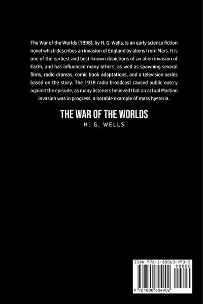 Do you want to read The War of the Worlds? If so then keep reading... The War of the Worlds (1898), by H. G. Wells, is an early science fiction novel which describes an invasion of England by aliens from Mars. It is one of the earliest and best-known depictions of an alien invasion of Earth, and has influenced many others, as well as spawning several films, radio dramas, comic book adaptations, and a television series based on the story. The 1938 radio broadcast caused public outcry against the episode, as many listeners believed that an actual Martian invasion was in progress, a notable example of mass hysteria. What are you waiting for The War of the Worlds is one click away, select the "Buy Now" button in the top right corner NOW!
