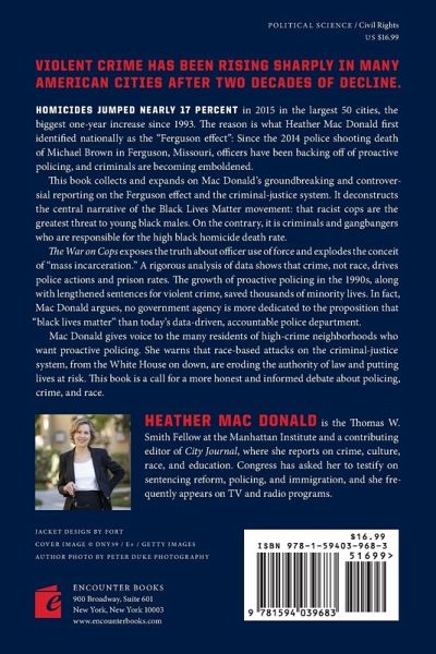 Violent crime has been rising sharply in many American cities after two decades of decline. Homicides jumped nearly 17 percent in 2015 in the largest 50 cities, the biggest one-year increase since 1993. The reason is what Heather Mac Donald first identified nationally as the ¿Ferguson effect¿: Since the 2014 police shooting death of Michael Brown in Ferguson, Missouri, officers have been backing off of proactive policing, and criminals are becoming emboldened. This book expands on Mac Donald¿s groundbreaking and controversial reporting on the Ferguson effect and the criminal-justice system. It deconstructs the central narrative of the Black Lives Matter movement: that racist cops are the greatest threat to young black males. On the contrary, it is criminals and gangbangers who are responsible for the high black homicide death rate. The War on Cops exposes the truth about officer use of force and explodes the conceit of ¿mass incarceration.¿ A rigorous analysis of data shows that crime, not race, drives police actions and prison rates. The growth of proactive policing in the 1990s, along with lengthened sentences for violent crime, saved thousands of minority lives. In fact, Mac Donald argues, no government agency is more dedicated to the proposition that ¿black lives matter¿ than today¿s data-driven, accountable police department. Mac Donald gives voice to the many residents of high-crime neighborhoods who want proactive policing. She warns that race-based attacks on the criminal-justice system, from the White House on down, are eroding the authority of law and putting lives at risk. This book is a call for a more honest and informed debate about policing, crime, and race.