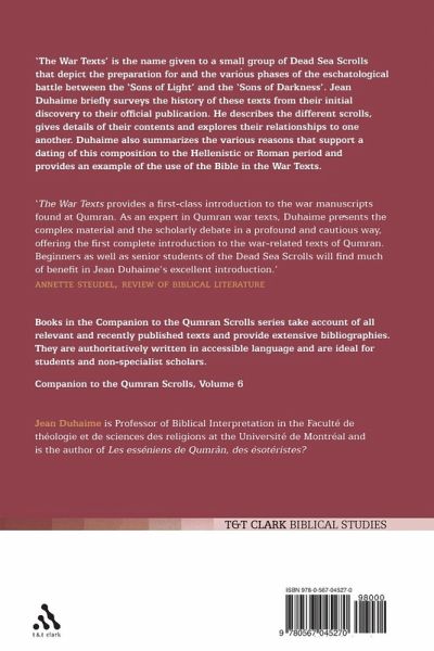 The War Texts is the name given to a small group of Dead Sea Scrolls that depict the preparation for and the various phases of the eschatological battle between the 'Sons of Light' and the 'Sons of Darkness'. Jean Duhaime briefly surveys the history of these texts from their initial discovery to their official publication. He describes the different scrolls and gives details of their contents and their relationships to one another. Duhaime summarizes the various reasons supporting a dating of this composition to the Hellenistic or Roman period and provides an example of the use of the Bible in the War Texts. The contributors to the Companion to the Qumran Scrolls series take account of all relevant and recently published texts and provide extensive bibliographies. The books in the series are authoritatively written in accessible language and are ideal for students and non-specialist scholars. Companion to the Qumran Scrolls, 6