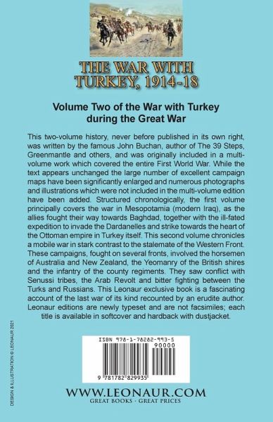 Volume two of the War with Turkey during the Great War This two-volume history, never before published in its own right, was written by the famous John Buchan, author of The 39 Steps, Greenmantle and others, and was originally included in a multi-volume work which covered the entire First World War. While the text appears unchanged the large number of excellent campaign maps have been significantly enlarged and numerous photographs and illustrations which were not included in the multi-volume edition have been added. Structured chronologically, the first volume principally covers the war in Mesopotamia (modern Iraq), as the allies fought their way towards Baghdad, together with the ill-fated expedition to invade the Dardanelles and strike towards the heart of the Ottoman empire in Turkey itself. This second volume chronicles a mobile war in stark contrast to the stalemate of the Western Front. These campaigns, fought on several fronts, involved the horsemen of Australia and New Zealand, the Yeomanry of the British shires and the infantry of the county regiments. They saw conflict with Senussi tribes, the Arab Revolt and bitter fighting between the Turks and Russians. This Leonaur exclusive book is a fascinating account of the last war of its kind recounted by an erudite author. Leonaur editions are newly typeset and are not facsimiles; each title is available in softcover and hardback with dustjacket.