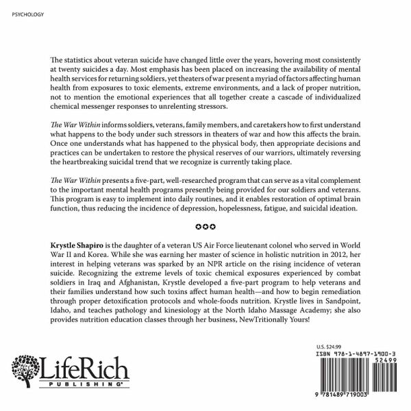 The statistics about veteran suicide have changed little over the years, hovering most consistently at twenty suicides a day. Most emphasis has been placed on increasing the availability of mental health services for returning soldiers, yet theaters of war present a myriad of factors affecting human health from exposures to toxic elements, extreme environments, and a lack of proper nutrition, not to mention the emotional experiences that all together create a cascade of individualized chemical messenger responses to unrelenting stressors. The War Within informs soldiers, veterans, family members, and caretakers how to first understand what happens to the body under such stressors in theaters of war and how this affects the brain. Once one understands what has happened to the physical body, then appropriate decisions and practices can be undertaken to restore the physical reserves of our warriors, ultimately reversing the heartbreaking suicidal trend that we recognize is currently taking place. The War Within presents a five-part, well-researched program that can serve as a vital complement to the important mental health programs presently being provided for our soldiers and veterans. This program is easy to implement into daily routines, and it enables restoration of optimal brain function, thus reducing the incidence of depression, hopelessness, fatigue, and suicidal ideation.