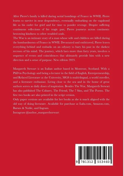 Margareth Stewart is an Italian author based in Montrose, Scotland. With a PhD in Psychology and being a lecturer in the field of English, Entrepreneurship, and Related Literature at the University, MGS is multi-lingual, a world traveller, and a literature enthusiast. Living close to the sea and in the home of great authors serves as daily doses of inspiration. Besides The War, Margareth Stewart has also published The Cabaret, The Friend, The 7 Sins, and The Poems. The first two books are also printed in the script version. Only paper versions are available for her books as she is much aligned with the old way of doing literature. Available for purchase at Lulu.com, Amazon.com, Barnes & Noble, and Ingram. @author_margarethstewart