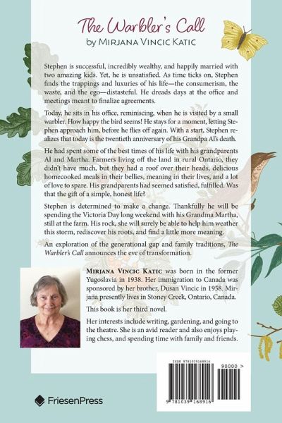 Stephen is successful, incredibly wealthy, and happily married with two amazing kids. Yet, he is unsatisfied. As time ticks on, Stephen finds the trappings and luxuries of his life-the consumerism, the waste, and the ego-distasteful. He dreads days at the office and meetings meant to finalize agreements. Today, he sits in his office, reminiscing, when he is visited by a small warbler. How happy the bird seems! He stays for a moment, letting Stephen approach him, before he flies off again. With a start, Stephen realizes that today is the twentieth anniversary of his Grandpa Al's death. He had spent some of the best times of his life with his grandparents Al and Martha. Farmers living off the land in rural Ontario, they didn't have much, but they had a roof over their heads, delicious homecooked meals in their bellies, meaning in their lives, and a lot of love to spare. His grandparents had seemed satisfied, fulfilled. Was that the gift of a simple, honest life? Stephen is determined to make a change. Thankfully he will be spending the Victoria Day long weekend with his Grandma Martha, still at the farm. His rock, she will surely be able to help him weather this storm, rediscover his roots, and find a little more meaning. An exploration of the generational gap and family traditions, The Warbler's Call announces the eve of transformation.