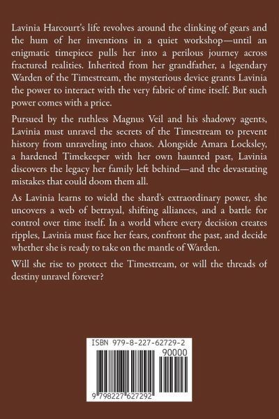 Lavinia Harcourt's life revolves around the clinking of gears and the hum of her inventions in a quiet workshop-until an enigmatic timepiece pulls her into a perilous journey across fractured realities. Inherited from her grandfather, a legendary Warden of the Timestream, the mysterious device grants Lavinia the power to interact with the very fabric of time itself. But such power comes with a price. Pursued by the ruthless Magnus Veil and his shadowy agents, Lavinia must unravel the secrets of the Timestream to prevent history from unraveling into chaos. Alongside Amara Locksley, a hardened Timekeeper with her own haunted past, Lavinia discovers the legacy her family left behind-and the devastating mistakes that could doom them all. As Lavinia learns to wield the shard's extraordinary power, she uncovers a web of betrayal, shifting alliances, and a battle for control over time itself. In a world where every decision creates ripples, Lavinia must face her fears, confront the past, and decide whether she is ready to take on the mantle of Warden. Will she rise to protect the Timestream, or will the threads of destiny unravel forever?