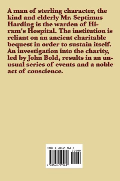A man of sterling character, the kind and elderly Mr. Septimus Harding is the warden of Hiram's Hospital. The institution is reliant on an ancient charitable bequest in order to sustain itself. An investigation into the charity, led by John Bold, results in an unusual series of events and a noble act of conscience.