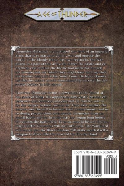 Diomedes Melas has orchestrated the theft of an imperial army that is to march to Valiri's war and oppose the Horde of the Bloody Hand. His own regiment, the Warguard, is a part of this army. He leaves the castle and everything else behind, the life he had made for himself, his woman and any future they might have had together, his brother and half of the Snow Lions. He leaves knowing that he cannot return even should he survive the desperate battles that lie ahead. However, Diomedes is but a newcomer to the board of the game of kings. His opponents have vastly greater experience and resources and care not for Valiri's war or for the danger to their own lands. They have neither the bravery nor the will to honour their commitments and in so doing, protect their own people. Diomedes faces an uphill battle and for him the war has begun long before he reaches the battlefield. Even so, should he lose the political battle, Diomedes will not turn back. The Warguard will march and the Black Captain will make death itself a weapon to drive into the heart of the Bloody Hand.