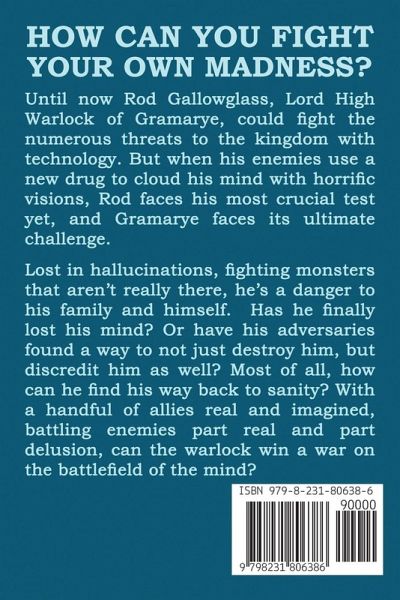 HOW CAN YOU FIGHT YOUR OWN MADNESS? Until now Rod Gallowglass, Lord High Warlock of Gramarye, could fight the numerous threats to the kingdom with technology. But when his enemies use a new drug to cloud his mind with horrific visions, Rod faces his most crucial test yet, and Gramarye faces its ultimate challenge. Lost in hallucinations, fighting monsters that aren't really there, he's a danger to his family and himself. Has he finally lost his mind? Or have his adversaries found a way to not just destroy him, but discredit him as well? Most of all, how can he find his way back to sanity? With a handful of allies real and imagined, battling enemies part real and part delusion, can the warlock win a war on the battlefield of the mind?