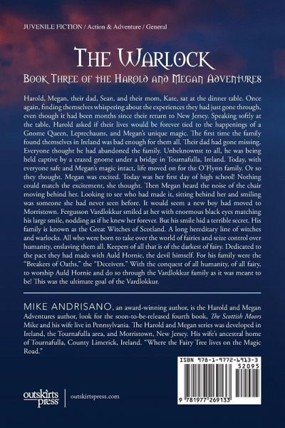 Harold, Megan, their dad, Sean, and their mom, Kate, sat at the dinner table. Once again, finding themselves whispering about the experiences they had just gone through, even though it had been months since their return to New Jersey. Speaking softly at the table, Harold asked if their lives would be forever tied to the happenings of a Gnome Queen, Leprechauns, and Megan's unique magic. The first time the family found themselves in Ireland was bad enough for them all. Their dad had gone missing. Everyone thought he had abandoned the family. Unbeknownst to all, he was being held captive by a crazed gnome under a bridge in Tournafulla, Ireland. Today, with everyone safe and Megan's magic intact, life moved on for the O'Flynn family. Or so they thought. Megan was excited. Today was her first day of high school! Nothing could match the excitement, she thought. Then Megan heard the noise of the chair moving behind her. Looking to see who had made it, sitting behind her and smiling was someone she had never seen before. It would seem a new boy had moved to Morristown. Fergusson Vardlokkur smiled at her with enormous black eyes matching his large smile, nodding as if he knew her forever. But his smile hid a terrible secret. His family is known as the Great Witches of Scotland. A long hereditary line of witches and warlocks. All who were born to take over the world of fairies and seize control over humanity, enslaving them all. Keepers of all that is of the darkest of fairy. Dedicated to the pact they had made with Auld Hornie, the devil himself. For his family were the "Breakers of Oaths," the "Deceivers." With the conquest of all humanity, of all fairy, to worship Auld Hornie and do so through the Vardlokkur family as it was meant to be! This was the ultimate goal of the Vardlokkur. MIKE ANDRISANO, an award-winning author, is the Harold and Megan Adventures author, look for the soon-to-be-released fourth book, The Scottish Moors Mike and his wife live in Pennsylvania. The Harold and Megan series was developed in Ireland, the Tournafulla area, and Morristown, New Jersey. His wife's ancestral home of Tournafulla, County Limerick, Ireland. "Where the Fairy Tree lives on the Magic Road."