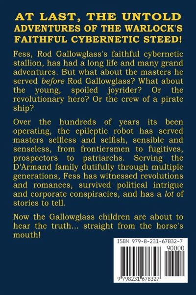 AT LAST, THE UNTOLD ADVENTURES OF THE WARLOCK'S FAITHFUL CYBERNETIC STEED! Fess, Rod Gallowglass's faithful cybernetic stallion, has had a long life and many grand adventures. But what about the masters he served before Rod Gallowglass? What about the young, spoiled joyrider? Or the revolutionary hero? Or the crew of a pirate ship? Over the hundreds of years its been operating, the epileptic robot has served masters selfless and selfish, sensible and senseless, from frontiersmen to fugitives, prospectors to patriarchs Now the Gallowglass children are about to hear the truth... straight from the horse's mouth!
