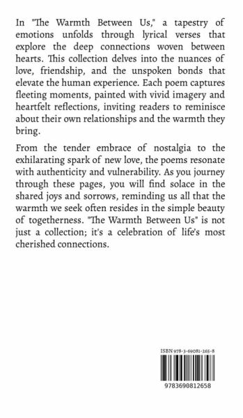 In "The Warmth Between Us," a tapestry of emotions unfolds through lyrical verses that explore the deep connections woven between hearts. This collection delves into the nuances of love, friendship, and the unspoken bonds that elevate the human experience. Each poem captures fleeting moments, painted with vivid imagery and heartfelt reflections, inviting readers to reminisce about their own relationships and the warmth they bring. From the tender embrace of nostalgia to the exhilarating spark of new love, the poems resonate with authenticity and vulnerability. As you journey through these pages, you will find solace in the shared joys and sorrows, reminding us all that the warmth we seek often resides in the simple beauty of togetherness. "The Warmth Between Us" is not just a collection; it's a celebration of life's most cherished connections.