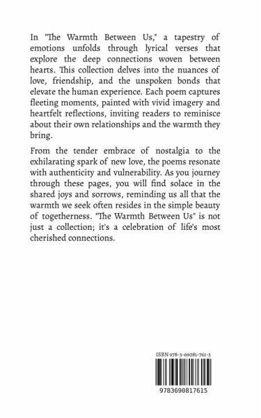 In "The Warmth Between Us," a tapestry of emotions unfolds through lyrical verses that explore the deep connections woven between hearts. This collection delves into the nuances of love, friendship, and the unspoken bonds that elevate the human experience. Each poem captures fleeting moments, painted with vivid imagery and heartfelt reflections, inviting readers to reminisce about their own relationships and the warmth they bring. From the tender embrace of nostalgia to the exhilarating spark of new love, the poems resonate with authenticity and vulnerability. As you journey through these pages, you will find solace in the shared joys and sorrows, reminding us all that the warmth we seek often resides in the simple beauty of togetherness. "The Warmth Between Us" is not just a collection; it's a celebration of life's most cherished connections.