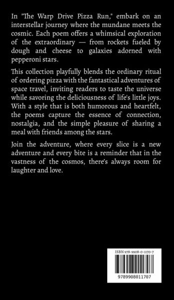 In "The Warp Drive Pizza Run," embark on an interstellar journey where the mundane meets the cosmic. Each poem offers a whimsical exploration of the extraordinary - from rockets fueled by dough and cheese to galaxies adorned with pepperoni stars. This collection playfully blends the ordinary ritual of ordering pizza with the fantastical adventures of space travel, inviting readers to taste the universe while savoring the deliciousness of life's little joys. With a style that is both humorous and heartfelt, the poems capture the essence of connection, nostalgia, and the simple pleasure of sharing a meal with friends among the stars. Join the adventure, where every slice is a new adventure and every bite is a reminder that in the vastness of the cosmos, there's always room for laughter and love.