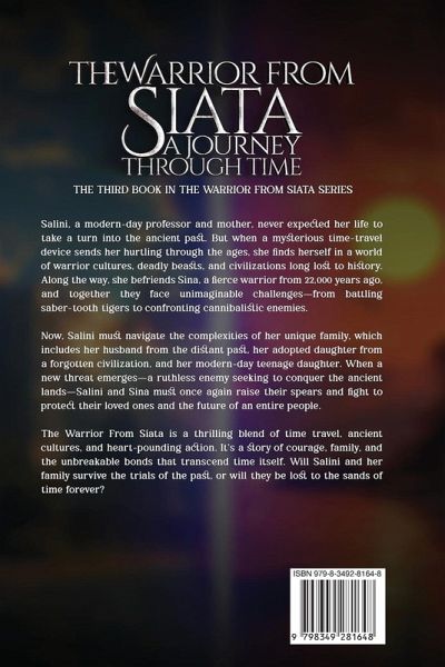 Salini, a modern-day professor and mother, never expected her life to take a turn into the ancient past. But when a mysterious time-travel device sends her hurtling through the ages, she finds herself in a world of warrior cultures, deadly beasts, and civilizations long lost to history. Along the way, she befriends Sina, a fierce warrior from 22,000 years ago. and together they face unimaginable challenges-from battling saber-tooth tigers to confronting cannibalistic enemies. Now, Salini must navigate the complexities of her unique family, which includes her husband from the distant past, her adopted daughter from a forgotten civilization, and her modern-day teenage daughter. When a new threat emerges-a ruthless enemy seeking to conquer the ancient lands-Salini and Sina must once again raise their spears and fight to protect their loved ones and the future of an entire people. The Warrior From Siata is a thrilling blend of time travel, ancient cultures, and heart-pounding action. It's a story of courage, family, and the unbreakable bonds that transcend time itself. Will Salini and her family survive the trials of the past, or will they be lost to the sands of time forever?