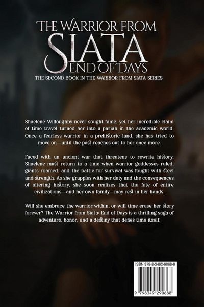 Shaelene Willoughby never sought fame, yet her incredible claim of time travel turned her into a pariah in the academic world. Once a fearless warrior in a prehistoric land, she has tried to move on-until the past reaches out to her once more. Faced with an ancient war that threatens to rewrite history. Shaelene must return to a time when warrior goddesses ruled. giants roamed, and the battle for survival was fought with steel and strength. As she grapples with her duty and the consequences of altering history, she soon realizes that the fate of entire civilizations--and her own family-may rest in her hands. Will she embrace the warrior within. or will time erase her story forever? The Warrior from Siata: End of Days is a thrilling saga of adventure. honor, and a destiny that defies time itself.