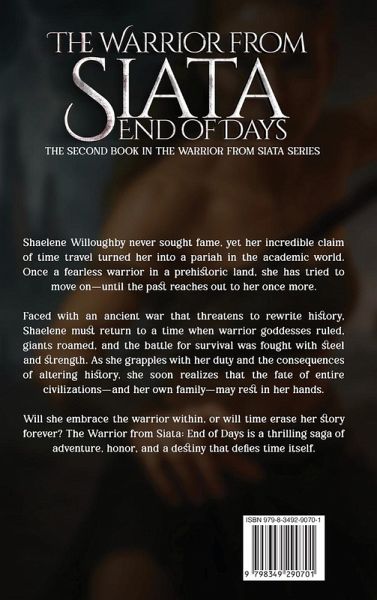 Shaelene Willoughby never sought fame, yet her incredible claim of time travel turned her into a pariah in the academic world. Once a fearless warrior in a prehistoric land, she has tried to move on-until the past reaches out to her once more. Faced with an ancient war that threatens to rewrite history. Shaelene must return to a time when warrior goddesses ruled. giants roamed, and the battle for survival was fought with steel and strength. As she grapples with her duty and the consequences of altering history, she soon realizes that the fate of entire civilizations--and her own family-may rest in her hands. Will she embrace the warrior within. or will time erase her story forever? The Warrior from Siata: End of Days is a thrilling saga of adventure. honor, and a destiny that defies time itself.