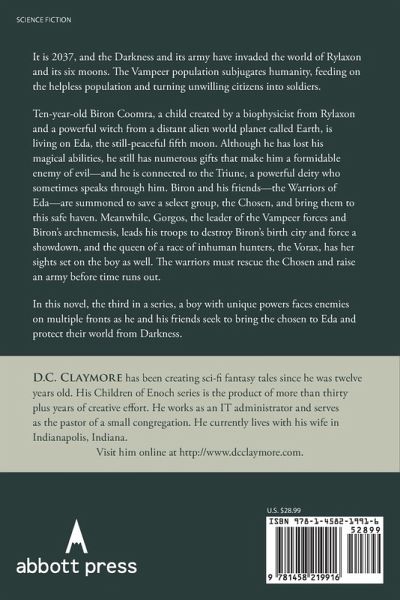 It is 2037, and the Darkness and its army have invaded the world of Rylaxon and its six moons. The Vampeer population subjugates humanity, feeding on the helpless population and turning unwilling citizens into soldiers. Ten-year-old Biron Coomra, a child created by a biophysicist from Rylaxon and a powerful witch from a distant alien world planet called Earth, is living on Eda, the still-peaceful fifth moon. Although he has lost his magical abilities, he still has numerous gifts that make him a formidable enemy of evil--and he is connected to the Triune, a powerful deity who sometimes speaks through him. Biron and his friends--the Warriors of Eda--are summoned to save a select group, the Chosen, and bring them to this safe haven. Meanwhile, Gorgos, the leader of the Vampeer forces and Biron's archnemesis, leads his troops to destroy Biron's birth city and force a showdown, and the queen of a race of inhuman hunters, the Vorax, has her sights set on the boy as well. The warriors must rescue the Chosen and raise an army before time runs out. In this novel, the third in a series, a boy with unique powers faces enemies on multiple fronts as he and his friends seek to bring the chosen to Eda and protect their world from Darkness.