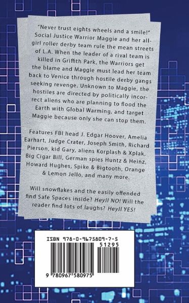 When Sirius, leader of a rival team, is assassinated in Griffith Park, the roller derby team The Warriors are blamed, and Maggie must lead her Warriors across Los Angeles through hostile roller derby gangs seeking revenge for the death of the rival leader. Unknown to all, the other gangs are directed by politically incorrect galactic aliens who want to flood the Earth with Global Warming. Features FBI head J. Edgar Hoover, Amelia Earhart, Joseph Smith, Judge Joseph Crater, astronomer Richard Pierson, the gloriously incompetent German spies Huntz and Heinz, Muslim Cross-Dressers Union Local 36, return of the Mormon hit-men Orange and Lemon Jello, Big Cigar Bill, Korplash and Xplak, Spike and Bigtooth, kid Gary, Howard Hughes, and many others. Will snowflakes and the easily offended find Safe Spaces inside? Heyll NO! Will the brave reader find lots of laughs? Heyll YES! Political Correctness meets its match in this work of eccentric mania, Book 3 of Adventures of Maggie, the Radiated Lesbian Nun.