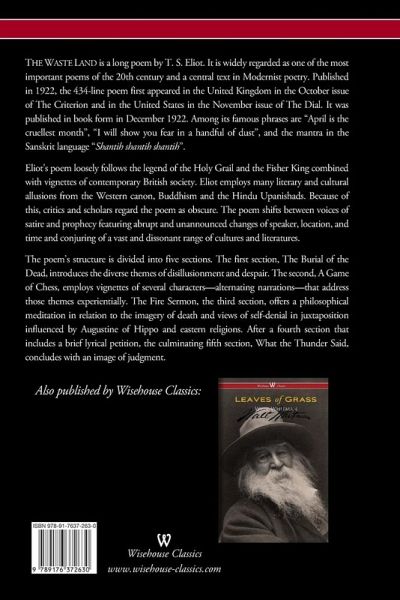 The Waste Land is a long poem by T. S. Eliot. It is widely regarded as one of the most important poems of the 20th century and a central text in Modernist poetry. Published in 1922, the 434-line poem first appeared in the United Kingdom in the October issue of The Criterion and in the United States in the November issue of The Dial. It was published in book form in December 1922. Among its famous phrases are "April is the cruellest month", "I will show you fear in a handful of dust", and the mantra in the Sanskrit language "Shantih shantih shantih". Eliot’s poem loosely follows the legend of…mehr