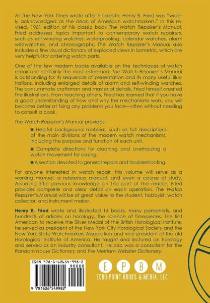 As The New York Times wrote after his death, Henry B. Fried was "widely acknowledged as the dean of American watchmakers." In the revised, 1961 edition of his classic book The Watch Repairer's Manual, reprinted here, Fried addresses topics important to contemporary watch repairers, such as self-winding watches, waterproofing, calendar watches, alarm wristwatches, and chronographs. The Watch Repairer's Manual also includes a fine visual dictionary of exploded views in isometric, which are very helpful for ordering watch parts. One of the few modern books available on the techniques of watch repair and certainly the most esteemed, The Watch Repairer's Manual is outstanding for its sequence of presentation and its many useful illustrations, including enlarged details of alarm and self-winding watches. The consummate craftsman and master of details, Fried himself created the illustrations. From teaching others, Fried has learned that if you have a good understanding of how and why the mechanisms work, you will become better at fixing any problems you face-often without needing to consult a book. The Watch Repairer's Manual provides: - Helpful background material, such as full descriptions of the main divisions of the modern watch mechanisms, including the purpose and function of each unit. - Complete directions for cleaning and overhauling a watch movement for casing. - A section devoted to general repairs and troubleshooting. For anyone interested in watch repair, this volume will serve as a working manual, a reference manual, and even a course of study. Assuming little previous knowledge on the part of the reader, Fried provides complete and clear detail on each operation. The Watch Repairer's Manual should be of great value to the student, hobbyist, watch collector, and instrument maker. Henry B. Fried wrote and illustrated 14 books, many pamphlets, and hundreds of articles on horology, the science of timepieces. The first American to receive the Silver Medal of the British Horological Institute, he served as president of the New York City Horological Society and the New York State Watchmakers Association and vice president of the old Horological Institute of America. He taught and lectured on horology and served as an industry consultant. He also was a consultant for the Random House Dictionary and the Merriam-Webster Dictionary.