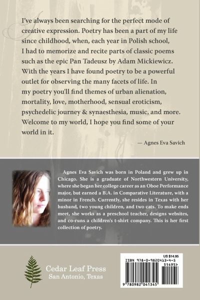 The Watcher: Poems is the first collection of poetry from Agnes Eva Savich. In it you will find themes of urban alienation, mortality, love, motherhood, sensual eroticism, psychedelic journey & synaesthesia, music, and much more. The author states: "Welcome to my world, I hope you find some of your world in it."