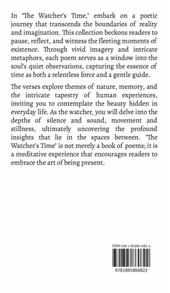 In "The Watcher's Time," embark on a poetic journey that transcends the boundaries of reality and imagination. This collection beckons readers to pause, reflect, and witness the fleeting moments of existence. Through vivid imagery and intricate metaphors, each poem serves as a window into the soul's quiet observations, capturing the essence of time as both a relentless force and a gentle guide. The verses explore themes of nature, memory, and the intricate tapestry of human experiences, inviting you to contemplate the beauty hidden in everyday life. As the watcher, you will delve into the depths of silence and sound, movement and stillness, ultimately uncovering the profound insights that lie in the spaces between. "The Watcher's Time" is not merely a book of poems; it is a meditative experience that encourages readers to embrace the art of being present.