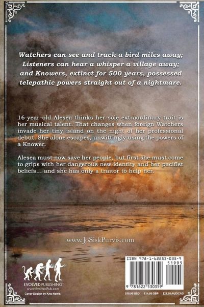 Watchers can see and track a bird miles away; Listeners can hear a whisper a village away; and Knowers, extinct for 500 years, possessed telepathic powers straight out of a nightmare. "The novel's world-building is stellar... renders the complex history and culture of Alesea's world with rich, evocative detail... With its deft storytelling, colorful and polished writing, and immensely likable central character, THE WATCHERS by Jo Sisk-Purvis is a captivating opening chapter of a promising new fantasy adventure series." ~ Indie Reader, Edward Sung (4.5 STARS) 16-year-old Alesea thinks her sole extraordinary trait is her musical talent. That changes when foreign Watchers invade her tiny island on the night of her professional debut. She alone escapes, unwittingly using the powers of a Knower. Alesea must now save her people, but first she must come to grips with her dangerous new identity and her pacifist beliefs... and she has only a traitor to help her. EVOLVED PUBLISHING PRESENTS the first thrilling installment in "The Trekana" series of other-world, young adult, sci-fi/fantasy adventures. "Jo Sisk-Purvis weaves a fascinating journey into the fantasy world of The Watchers. When I finish a book and instantly want to start the next in the series, I know the author has succeeded; this author has, and I can highly recommend The Watchers." ~ Readers' Favorite Book Reviews, Grant Leishman (5 STARS) "A captivating YA fantasy with great character development and strong series potential... YA fantasy fans are going to love The Watchers. This book has adventure, fascinating lore, colorful characters, and a smidge of slow burn romance." ~ Independent Book Review "This is a fine book, and the first part of what will be an important young adult trilogy, but one that adults can enjoy as well. A new talent has given us a fine gift. Buy it, read it, and think deeply about the story. The rewards are magnificent." ~ Philip Lee Williams, American Novelist, Poet, and Essayist