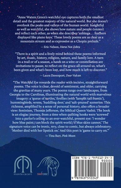 In this collection, Anne Waters Green "captures both the smallest detail and the greatest majesty of the natural world. But she doesn't overlook the peaks and valleys of the human world." Her poems are "informed by art, music, history, religion, nature, and family lore"- an invitation to pause "to reflect on the grace all around us, what's been given and what's been lost, and how much is left to discover." "Anne Waters Green's watchful eye captures both the smallest detail and the greatest majesty of the natural world. But she doesn't overlook the peaks and valleys of the human world. Insightful as well as watchful, she shows how nature and people connect and reflect each other, as when she describes 'anhingä.¿.¿.¿feathers displayed like piano keys.' These lovely poems are as clear as a mountain stream and as expressive as a Chopin prelude." -¿Eric Nelson, Horse Not Zebra "There is a spirit and a lively mind behind these poems informed by art, music, history, religion, nature, and family lore. A turn in a trail or of a season, a hawk on a wire or constellation are invitations to pause, to reflect on the grace all around us, what's been given and what's been lost, and how much is left to discover." -¿Laura Davenport, Dear Vulcan "The Watchful Eye rewards the reader with incisive, straightforward poems. The voice is clear, devoid of sentiment, and older, carrying the gravitas of many years. The poems range over landscapes, from Georgia to the Carolinas, illuminating the natural world with marvelous imagery: a 'queue of turtles,' fireflies (with 'lamplit tail frantic'), hummingbirds, wrens, 'huddling deer,' and 'salt-pruned' sceneries. This richness, amplified by a sense of personal history, also offers a broader view: feminism, Thomas Jefferson, the biblical Queen Vashti. The book is an elegiac journey, from a time when quilting hooks were 'screwed' into a parlor's ceiling to an ever-watchful, present eye: 'I wonder how blue paint¿/¿can block the spirit world¿/¿if blue skies cannot.' The signature voice can be ironic, wry, close to comic, but always celebratory. 'Mother died with her lipstick on.' And this poet is 'game to carry on.'¿" -¿Tina Barr, Pink Moon