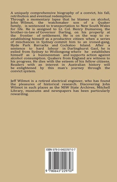 A uniquely comprehensive biography of a convict, his fall, retribution and eventual redemption. Through a momentary lapse that he blames on alcohol, John Wilmot, the watchmaker son of a Quaker family, is sentenced to transportation to New South Wales for life. He is assigned to Lt. Col. Henry Dumaresq, the brother-in-law of Governor Darling, on his property at the frontier of settlement. He is on the way to re-establishing himself as a productive citizen when a series of mischances in Sydney commit him to an ironed-gang, Hyde Park Barracks and Cockatoo Island. After a sentence to hard labour in Darlinghurst Gaol, he is exiled from Sydney to Wollongong where he establishes himself as a businessman and supports action against alcohol consumption. Quakers from England are witness to his progress. He dies with the esteem of his fellow citizens. Readers with an interest in Australian history will be enlightened by this man's journey through the convict system.