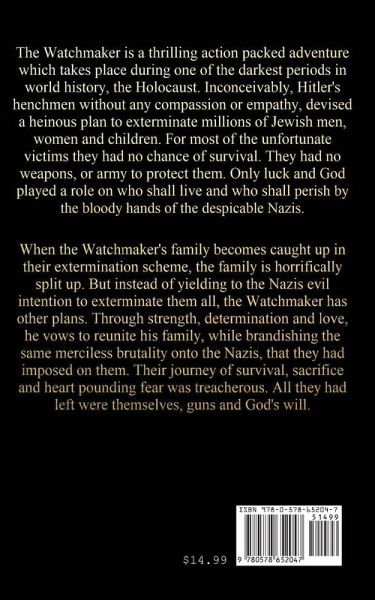 The Watchmaker is a thrilling action packed adventure which takes place during one of the darkest periods in world history, the Holocaust. Inconceivably, Hitler's henchmen without any compassion or empathy, devised a heinous plan to exterminate millions of Jewish men, women and children. For most of the unfortunate victims they had no chance of survival. They had no weapons, or army to protect them. Only luck and god played a role on who shall live and who shall perish by the bloody hands of the despicable Nazis. When the Watchmaker's family becomes caught up in their extermination scheme, the family is horrifically split up. But instead of yielding to the Nazis evil intention to exterminate them all, the Watchmaker has other plans. Through strength, determination and love, he vows to reunite his family, while brandishing the same merciless brutality onto the Nazis, that they had imposed on them. Their journey of survival, sacrifice and heart pounding fear was treacherous. All they had left were themselves, guns and god's will.