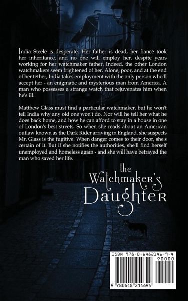 India Steele is desperate. Her father is dead, her fiancé took her inheritance, and no one will employ her, despite years working for her watchmaker father. Indeed, the other London watchmakers seem frightened of her. Alone, poor, and at the end of her tether, India takes employment with the only person who'll accept her - an enigmatic and mysterious man from America. A man who possesses a strange watch that rejuvenates him when he's ill. Matthew Glass must find a particular watchmaker, but he won't tell India why any old one won't do. Nor will he tell her what he does back home, and how he can afford to stay in a house in one of London's best streets. So when she reads about an American outlaw known as the Dark Rider arriving in England, she suspects Mr. Glass is the fugitive. When danger comes to their door, she's certain of it. But if she notifies the authorities, she'll find herself unemployed and homeless again - and she will have betrayed the man who saved her life. With a cast of quirky characters, an intriguing mystery, and a dash of romance, THE WATCHMAKER'S DAUGHTER is the start of a thrilling new historical fantasy series from the author of the bestselling Ministry of Curiosities, Freak House, and Emily Chambers Spirit Medium books.