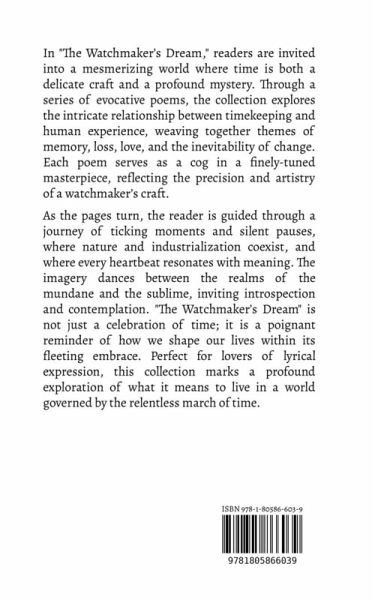 In "The Watchmaker's Dream," readers are invited into a mesmerizing world where time is both a delicate craft and a profound mystery. Through a series of evocative poems, the collection explores the intricate relationship between timekeeping and human experience, weaving together themes of memory, loss, love, and the inevitability of change. Each poem serves as a cog in a finely-tuned masterpiece, reflecting the precision and artistry of a watchmaker's craft. As the pages turn, the reader is guided through a journey of ticking moments and silent pauses, where nature and industrialization coexist, and where every heartbeat resonates with meaning. The imagery dances between the realms of the mundane and the sublime, inviting introspection and contemplation. "The Watchmaker's Dream" is not just a celebration of time; it is a poignant reminder of how we shape our lives within its fleeting embrace. Perfect for lovers of lyrical expression, this collection marks a profound exploration of what it means to live in a world governed by the relentless march of time.