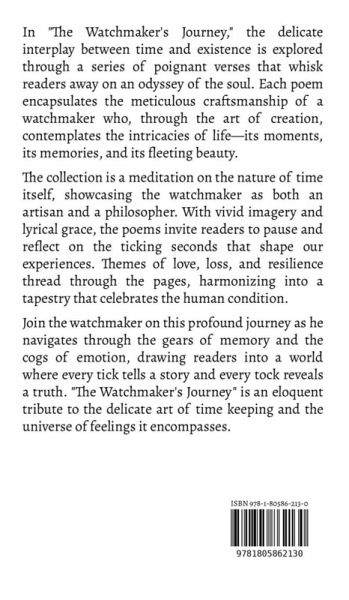 In "The Watchmaker's Journey," the delicate interplay between time and existence is explored through a series of poignant verses that whisk readers away on an odyssey of the soul. Each poem encapsulates the meticulous craftsmanship of a watchmaker who, through the art of creation, contemplates the intricacies of life-its moments, its memories, and its fleeting beauty. The collection is a meditation on the nature of time itself, showcasing the watchmaker as both an artisan and a philosopher. With vivid imagery and lyrical grace, the poems invite readers to pause and reflect on the ticking seconds that shape our experiences. Themes of love, loss, and resilience thread through the pages, harmonizing into a tapestry that celebrates the human condition. Join the watchmaker on this profound journey as he navigates through the gears of memory and the cogs of emotion, drawing readers into a world where every tick tells a story and every tock reveals a truth. "The Watchmaker's Journey" is an eloquent tribute to the delicate art of time keeping and the universe of feelings it encompasses.