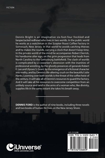 Dennis Bright is an imaginative six-foot-four freckled and bespectacled redhead who lives in two worlds. In the public world he works as a watchman in the Scepter Roast Coffee Factory in Somesuch, New Jersey. In that world he avoids catching thieves and he makes the rounds, carrying a clock that doesn't keep time. In the private world of the mind he accompanies Robert Derrick, his handsome alter ego, on the grim progression that leads from North Carolina to the Gettysburg battlefield. The clash of worlds is complicated by a coworker's obsession with the inanities of professional wrestling, by the ghostly presences of generals Robert E. Lee and Ulysses S. Grant, by the emergence of a fictional character into reality, and by Dennis's life-altering crush on the beautiful Julie Hanks. Looming over both worlds is the threat of the coffee heist of the century. It will take all of Dennis's resources to guard the factory. And it will take all his resources to overcome competition from an unlikely source and land in the arms of a woman who, like divinity, supplies life in the same instant she takes his breath away.