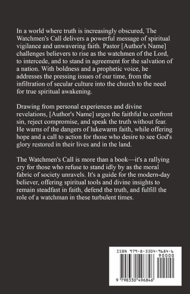In a world where truth is increasingly obscured, The Watchmen's Call delivers a powerful message of spiritual vigilance and unwavering faith. Pastor Bill Vincent challenges believers to rise as the watchmen of the Lord, to intercede, and to stand in agreement for the salvation of a nation. With boldness and a prophetic voice, he addresses the pressing issues of our time, from the infiltration of secular culture into the church to the need for true spiritual awakening. Drawing from personal experiences and divine revelations, Bill Vincent urges the faithful to confront sin, reject compromise, and speak the truth without fear. He warns of the dangers of lukewarm faith, while offering hope and a call to action for those who desire to see God's glory restored in their lives and in the land. The Watchmen's Call is more than a book-it's a rallying cry for those who refuse to stand idly by as the moral fabric of society unravels. It's a guide for the modern-day believer, offering spiritual tools and divine insights to remain steadfast in faith, defend the truth, and fulfill the role of a watchman in these turbulent times.