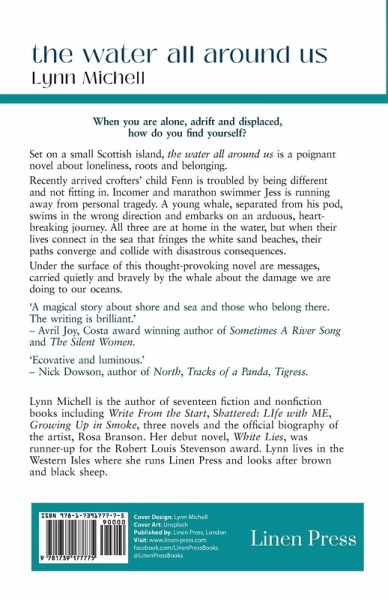 When you are alone, adrift and displaced, how do you find yourself? Set on a small Scottish island, The Water All Around Us is a poignant novel about loneliness, roots and belonging. Recently arrived, crofters' child, Fenn, is troubled by being different and not fitting in. Incomer and marathon swimmer, Jess, is running away from personal tragedy. A young whale, separated from his pod, swims in the wrong direction and embarks on an arduous, heart-breaking journey. All three are at home in the water, but when their lives connect in the sea that fringes the white-sand beaches, their paths converge and collide with disastrous consequences. Under the surface of this thought-provoking novel are messages, carried quietly and bravely by the whale, about the damage we are doing to our oceans.