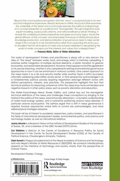 The Water-Food-Energy Nexus: Power, Politics and Justice lays out the managerial-technical definitions of the water, food and energy nexus and challenges these conceptions by bringing to the forefront the politics of the nexus.