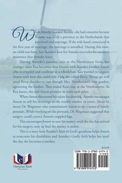 When Anneke married Romke, she had concerns because Romke was from a province in the Netherlands that practiced trial marriage. If the wife hasn't conceived in the first year of marriage, the marriage is annulled. During this time, no child was born, but Romke's love for Anneke overrules his mother's insistence that Anneke leave. During Anneke's parents' visit to the Veenhuizen farm, her younger sister Kea becomes close friends with Romke's brother Anton who is crippled and confined to a wheelchair. Kea wanted to impress Anton with how she could ride a pig she called Percy. Things go well until Percy decides to run though Mrs. Veenhuizen's rose garden, uprooting the bushes. That ended Kea's stay at the Veenhuizens. As Kea leaves, she and Anton promise to write each other. When Anton discovered his talent for drawing, Anneke encourages Anton to sell his drawings at the weekly market in town. There he meets Dr. Wagenaar who commissions Anton to do a series of family portraits. While working on the portraits, Dr. Wagenaar suggested that surgery could correct Anton's crippled legs. This encourages Anton to save his money until the day has arrived for his surgery, only to find the money is stolen. This is a story how Romke's faith in God's goodness helps Anton to overcome his disabilities and Anneke's Godly faith helps her until the day she becomes a mother.