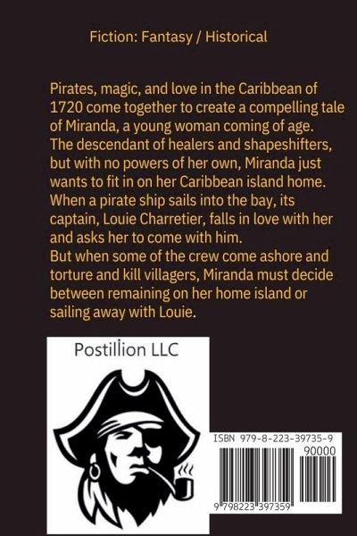 Pirates, magic, witches, and romance in the Caribbean of 1720 come together to create a compelling tale of Miranda, a young woman coming of age. The descendant of healers and shapeshifters, but with no powers of her own, Miranda just wants to fit in on her Caribbean island home. When a pirate ship sails into the bay, its captain, Louie Charretier, falls in love with her and asks her to sail away with him. But when some of the crew come ashore and torture and kill villagers, Miranda must decide between remaiing on her home island or leaving with the pirates.
