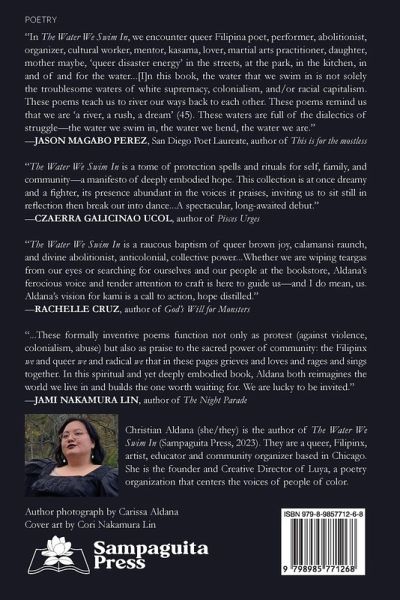 Christian Aldana's debut poetry collection, The Water We Swim In, is an ode to radical care. Through community organizing and deeply held love, Aldana follows in the footsteps of Grace Lee Boggs against a carceral state. They champion safety for all who need it while challenging the waters of our time, this state in which protection is needed. Aldana questions the broken system and shows us an alternative future well within our grasp. As she gives to others, she also gives to herself, allowing space for grief, acknowledging the distances between us in the diaspora. Unapologetically queer and neurodivergent, Aldana's writing exudes power and teaches us we will never drown as long as we have each other. Empowering, mobilizing, and unrelenting, The Water We Swim In is a poetic revolution, a manifesto for all who believe in fighting for more.