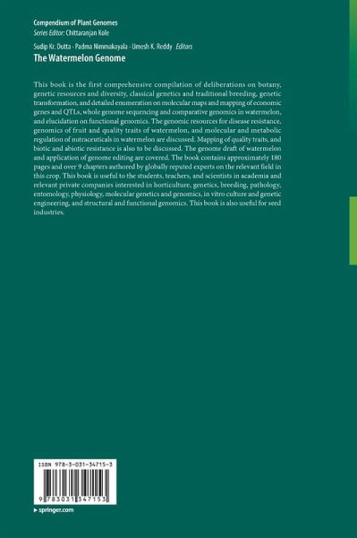 This book is the first comprehensive compilation of deliberations on botany, genetic resources and diversity, classical genetics and traditional breeding, genetic transformation, and detailed enumeration on molecular maps and mapping of economic genes and QTLs, whole genome sequencing and comparative genomics in watermelon, and elucidation on functional genomics. The genomic resources for disease resistance, genomics of fruit and quality traits of watermelon, and molecular and metabolic regulation of nutraceuticals in watermelon are discussed. Mapping of quality traits, and biotic and abiotic resistance is also to be discussed. The genome draft of watermelon and application of genome editing are covered. The book contains approximately 250 pages and over 10 chapters authored by globally reputed experts on the relevant field in this crop. This book is useful to the students, teachers, and scientists in academia and relevant private companies interested in horticulture, genetics, breeding, pathology, entomology, physiology, molecular genetics and genomics, in vitro culture and genetic engineering, and structural and functional genomics. This book is also useful for seed industries.