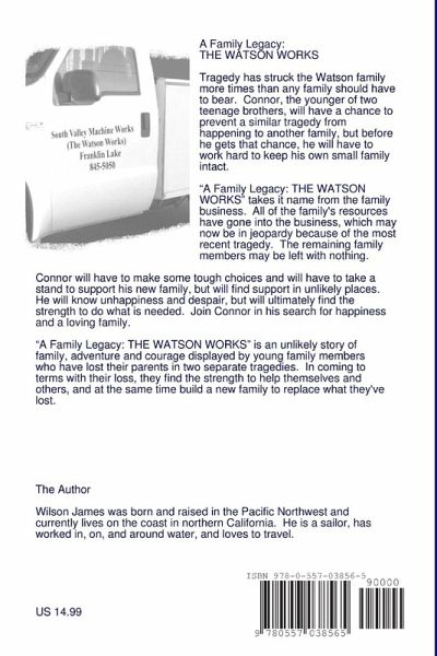 Tragedy has struck the Watson family more times than any family should have to bear. Connor, the younger of the two young teen brothers, will have a chance to prevent a similar tragedy from happening to another family, but before he gets that chance, he will have to work hard to keep his own small family intact. Connor will have to make some tough choices, and have to make a stand to support his new family, but will find support in unlikely places. He will know unhappiness and despair, but will ultimately find the strength to do what is needed. Join Connor in his search for happiness and a loving family. "A Family Legacy: THE WATSON WORKS" is an unlikely story of family, adventure and courage displayed by young family members who have lost their parents in two separate tragedies. In coming to terms with their loss, they find the strength to help themselves and others, and at the same time build a new family to replace what they've lost.