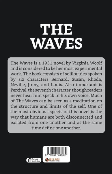 The Waves is a 1931 novel by Virginia Woolf and is considered to be her most experimental work. The book consists of soliloquies spoken by six characters Bernard, Susan, Rhoda, Neville, Jinny, and Louis. Also important is Percival, the seventh character, though readers never hear him speak in his own voice. Much of The Waves can be seen as a meditation on the structure and limits of the self. One of the most obvious aspects of this novel is the way that humans are both disconnected and isolated from one another and at the same time define one another.