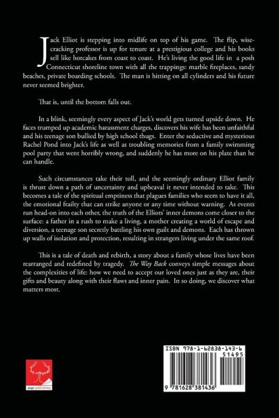 Jack Elliot is stepping into midlife on top of his game. The flip, wise-cracking professor is up for tenure at a prestigious college and his books sell like hotcakes from coast to coast. He's living the good life in a posh Connecticut shoreline town with all the trappings: marble fireplaces, sandy beaches, private boarding schools. The man is hitting on all cylinders and his future never seemed brighter. That is, until the bottom falls out. In a blink, seemingly every aspect of Jack's world gets turned upside down. He faces trumped up academic harassment charges, discovers his wife has been unfaithful and his teenage son bullied by high school thugs. Enter the seductive and mysterious Rachel Pond into Jack's life as well as troubling memories from a family swimming pool party that went horribly wrong, and suddenly he has more on his plate than he can handle. Such circumstances take their toll, and the seemingly ordinary Elliot family is thrust down a path of uncertainty and upheaval it never intended to take. This becomes a tale of the spiritual emptiness that plagues families who seem to have it all, the emotional frailty that can strike anyone or any time without warning. As events run head-on into each other, the truth of the Elliots' inner demons come closer to the surface: a father in a rush to make a living, a mother creating a world of escape and diversion, a teenage son secretly battling his own guilt and demons. Each has thrown up walls of isolation and protection, resulting in strangers living under the same roof. This is a tale of death and rebirth, a story about a family whose lives have been rearranged and redefined by tragedy. The Way Back conveys simple messages about the complexities of life: how we need to accept our loved ones just as they are, their gifts and beauty along with their flaws and inner pain. In so doing, we discover what matters most.