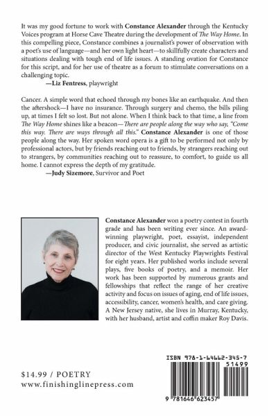 It was my good fortune to work with Constance Alexander through the Kentucky Voices program at Horse Cave Theatre during the development of The Way Home. In this compelling piece, Constance combines a journalist's power of observation with a poet's use of language-and her own light heart-to skillfully create characters and situations dealing with tough end of life issues. A standing ovation for Constance for this script, and for her use of theatre as a forum to stimulate conversations on a challenging topic. -Liz Fentress, playwright Cancer. A simple word that echoed through my bones like an earthquake. And then the aftershock-I have no insurance. Through surgery and chemo, the bills piling up, at times I felt so lost. But not alone. When I think back to that time, a line from The Way Home shines like a beacon-There are people along the way who say, "Come this way. There are ways through all this." Constance Alexander is one of those people along the way. Her spoken word opera is a gift to be performed not only by professional actors, but by friends reaching out to friends, by strangers reaching out to strangers, by communities reaching out to reassure, to comfort, to guide us all home. I cannot express the depth of my gratitude. -Judy Sizemore, Survivor and Poet