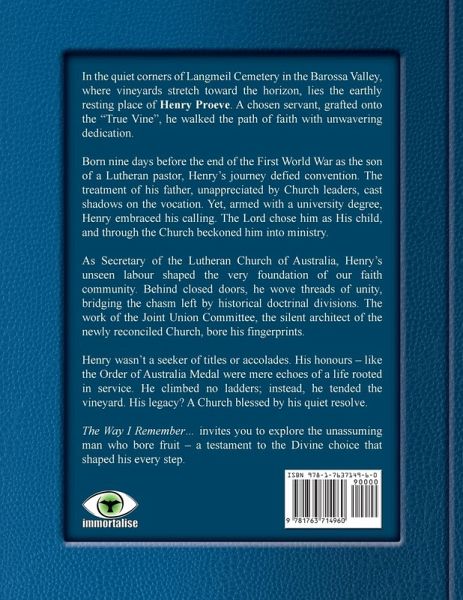 In the quiet corners of Langmeil Cemetery in the Barossa Valley, where vineyards stretch toward the horizon, lies the earthly resting place of Henry Proeve. A chosen servant, grafted onto the "True Vine", he walked the path of faith with unwavering dedication. Born nine days before the end of the First World War as the son of a Lutheran pastor, Henry's journey defied convention. The treatment of his father, unappreciated by Church leaders, cast shadows on the vocation. Yet, armed with a university degree, Henry embraced his calling. The Lord chose him as His child, and through the Church beckoned him into ministry. As Secretary of the Lutheran Church of Australia, Henry's unseen labour shaped the very foundation of our faith community. Behind closed doors, he wove threads of unity, bridging the chasm left by historical doctrinal divisions. The work of the Joint Union Committee, the silent architect of the newly reconciled Church, bore his fingerprints. Henry wasn't a seeker of titles or accolades. His honours - like the Order of Australia Medal were mere echoes of a life rooted in service. He climbed no ladders; instead, he tended the vineyard. His legacy? A Church blessed by his quiet resolve. The Way I Remember... invites you to explore the unassuming man who bore fruit - a testament to the Divine choice that shaped his every step.